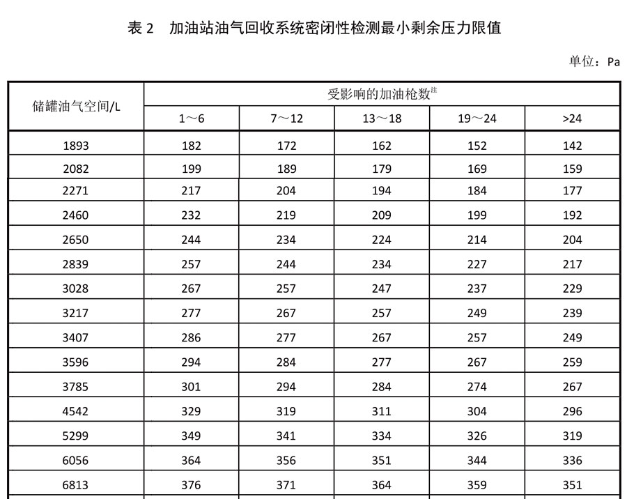 2、油气回收系统密闭性压力检测值应大于等于表 2 规定的小剩余压力限值。