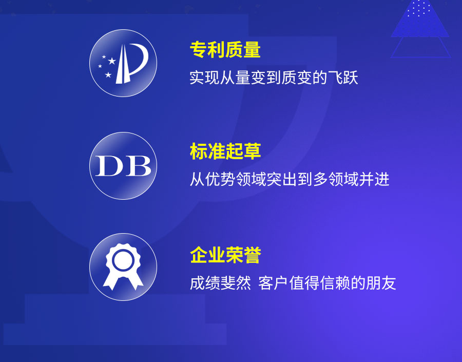 浏览量:1950【摘要】专利质量:实现从量变到质变的飞跃 标准起草:从优势领域突出到多领域并进 企业荣誉:成绩斐然 客户值得信赖的朋友