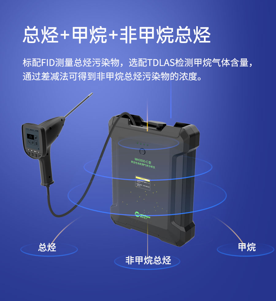 标配FID测量总烃污染物,选配TDLAS检测甲烷气体含量,通过差减法可得到非甲烷总烃污染物的浓度。