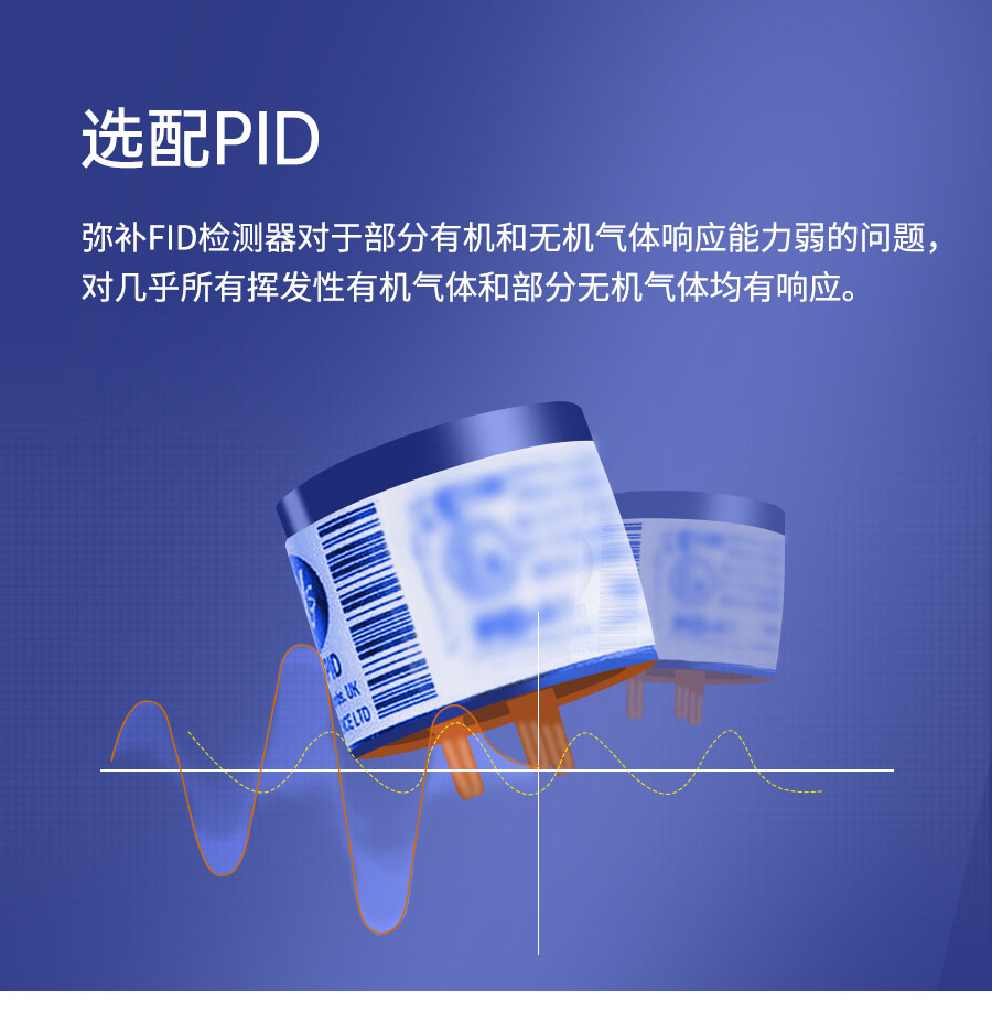 弥补FID检测器对于部分有机和无机气体响应能力弱的问题,对几乎所有挥发性有机气体和部分无机气体均有响应。