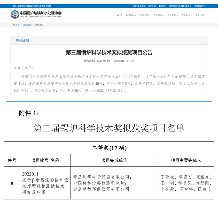 近日,中国锅炉与锅炉水处理协会发布的《第三届锅炉科学技术奖拟获奖项目名单》完成公示,青岛明华电子凭借《基于β射线法的锅炉低浓度颗粒物测试技术研究及应用》荣获二等奖,为明华电子在固定污染源烟尘浓度检测领域再添一项重要荣誉,也再次证明技术创新才是国产仪器企业崛起的必经之路。