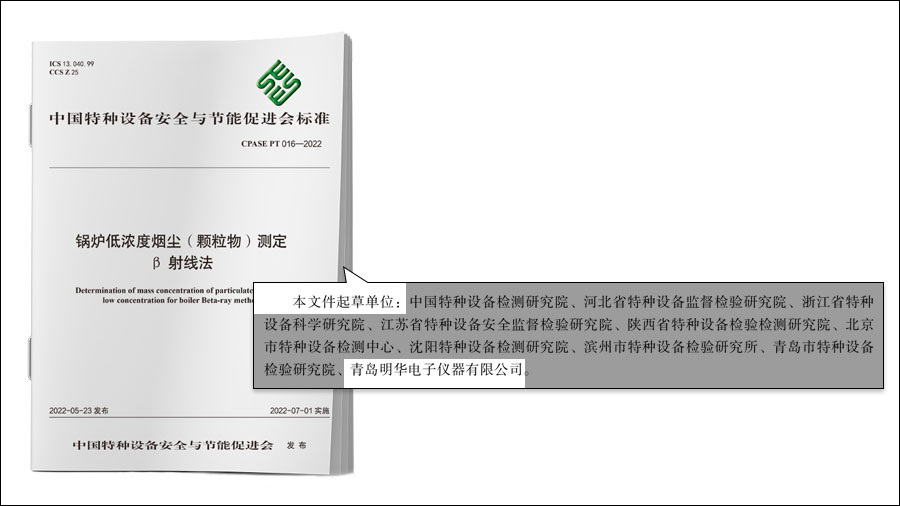 2022年,由中国特种设备安全与节能促进会发布的CPASE PT 016—2022《锅炉低浓度烟尘(颗粒物)测定 β射线法》正式实施,明华电子作为一家仪器制造商也参与了标准的起草编写工作,此次获得中国锅炉与锅炉水处理协会认可,可谓实至名归。