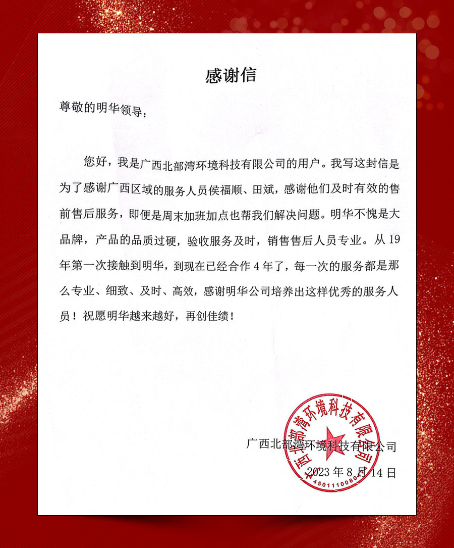 “到现在已经合作4年了,每一次服务都是那么专业、细致、及时、高效”,这是来自广西客户感谢信的评价。正是凭借尽心尽职的专业服务,让明华与客户建立了从陌生到信任,从信任再到信赖的合作之道。