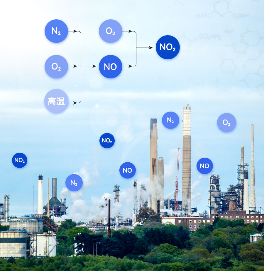 固定污染源排放的氮氧化物具有排放集中、浓度高、影响范围广的特点,在工业生产过程中,尤其是燃煤电厂、钢铁冶炼、水泥制造、焦化、玻璃窑炉等高温燃烧环节,氮气(N₂)和氧气(O₂)在高温条件下发生氧化反应,生成以一氧化氮(NO)为主的氮氧化物。这部分NO在排放过程中进一步与氧气反应,形成二氧化氮(NO₂)。
