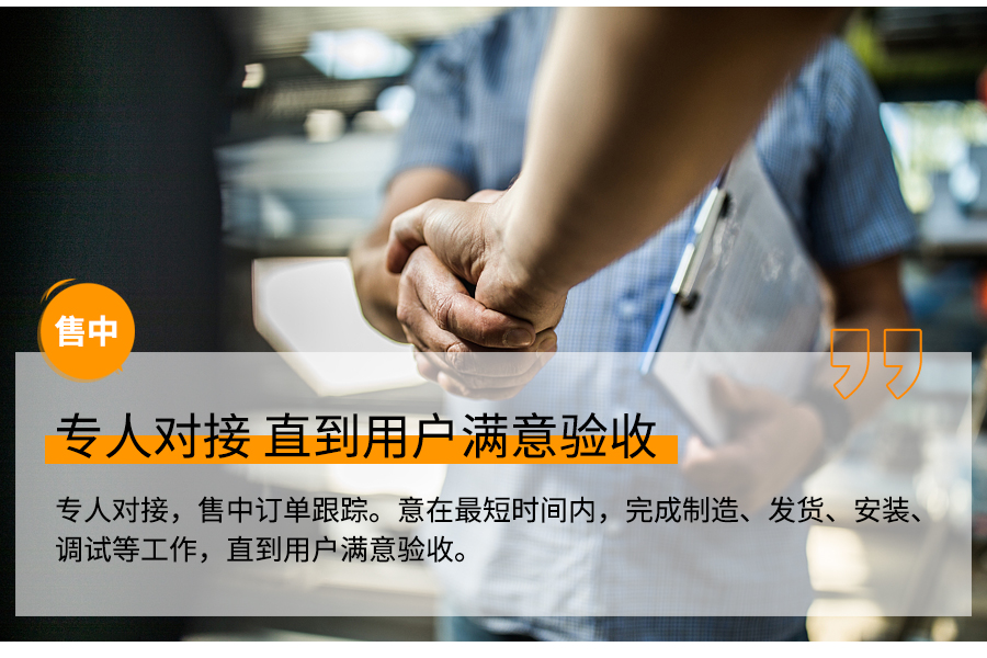 专人对接,售中订单跟踪。意在短时间内,完成制造、发货、安装、调试等工作,直到用户满意验收。