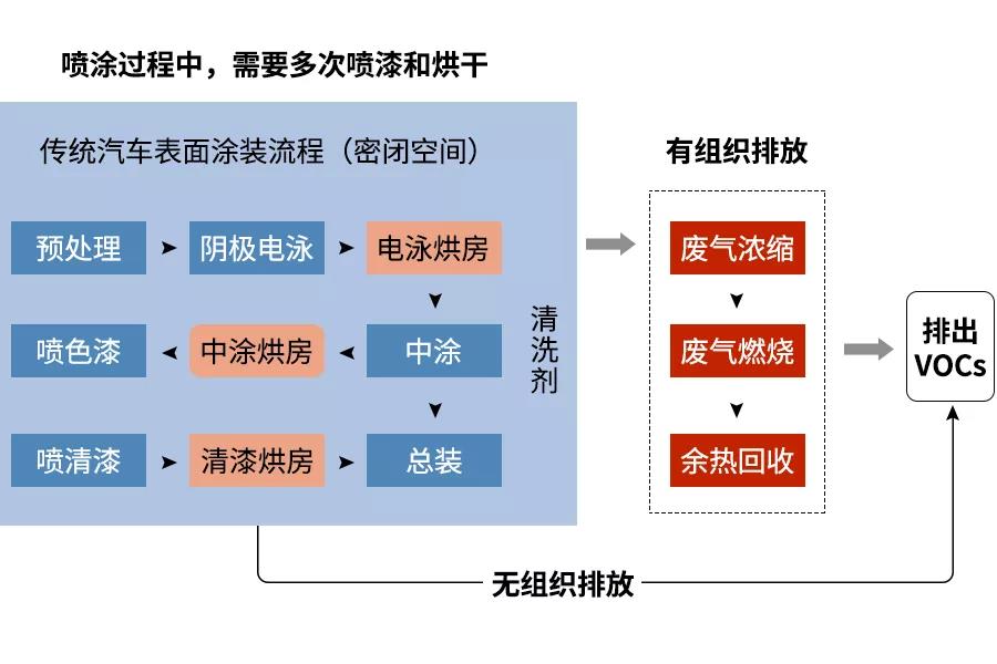 VOCs污染源普查结果表明,生产过程中存在涂装工序的企业类型众多,以排放量较大的汽车涂装为例,其涂装工艺产污环节如下: