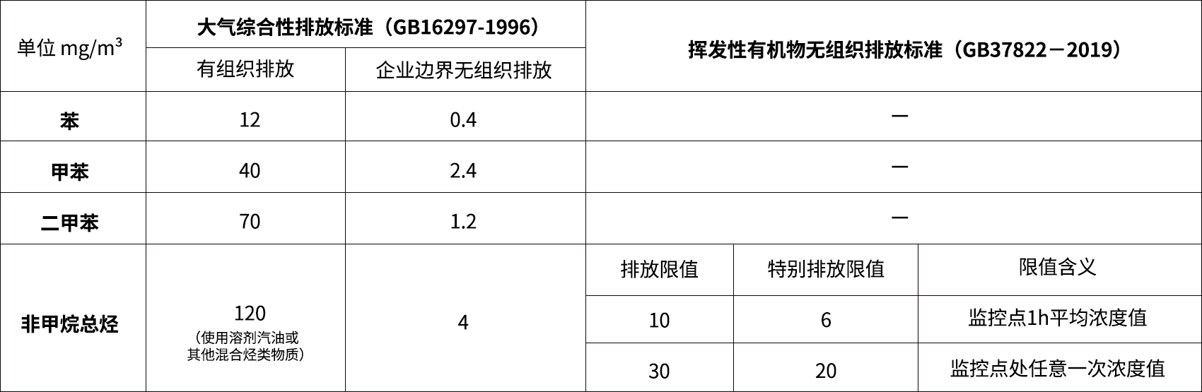 目前,*层面尚未出台针对涂装工业挥发性有机物排放标准,仅有《大气污染物综合排放标准(GB16297-1996)》和《挥发性有机物无组织排放控制标准》,上述标准涉及的主要挥发性有机物排放浓度限值见下表。
