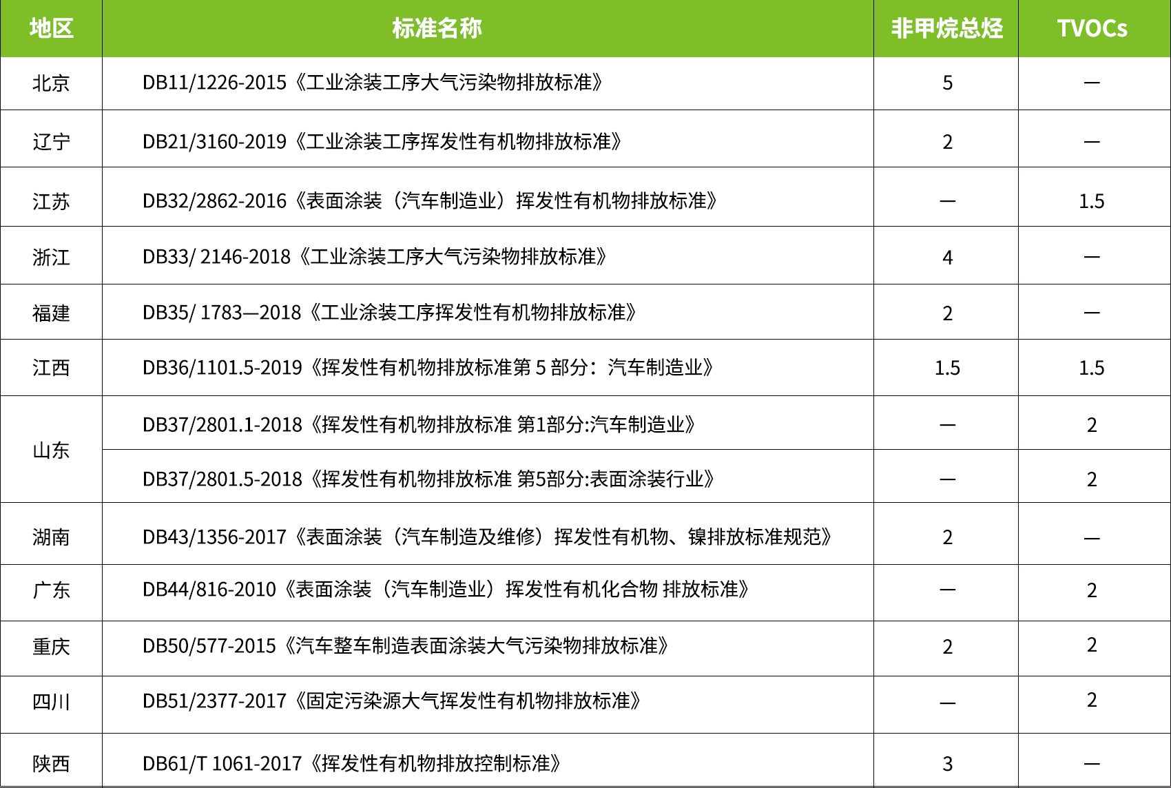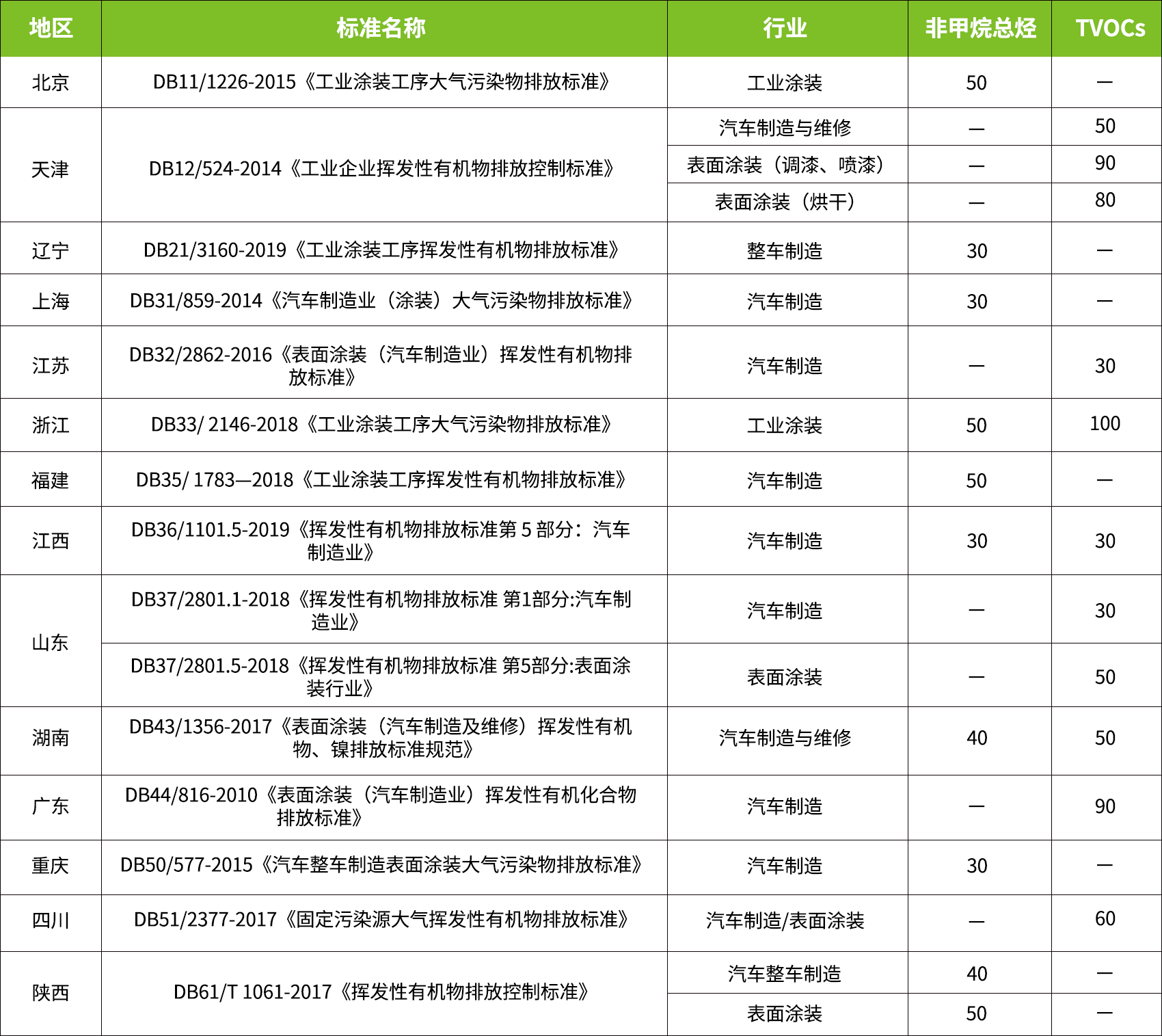 为打赢蓝天保卫战,持续改善空气质量,各省市制定了严格的挥发性有机物排放标准,各省市涉及工业涂装行业的地方标准内容如下: