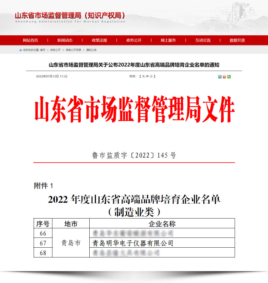 近日,山东省市场监督管理局公布《2022年度山东省高端品牌培育企业名单》,青岛明华电子仪器有限公司成功入选。