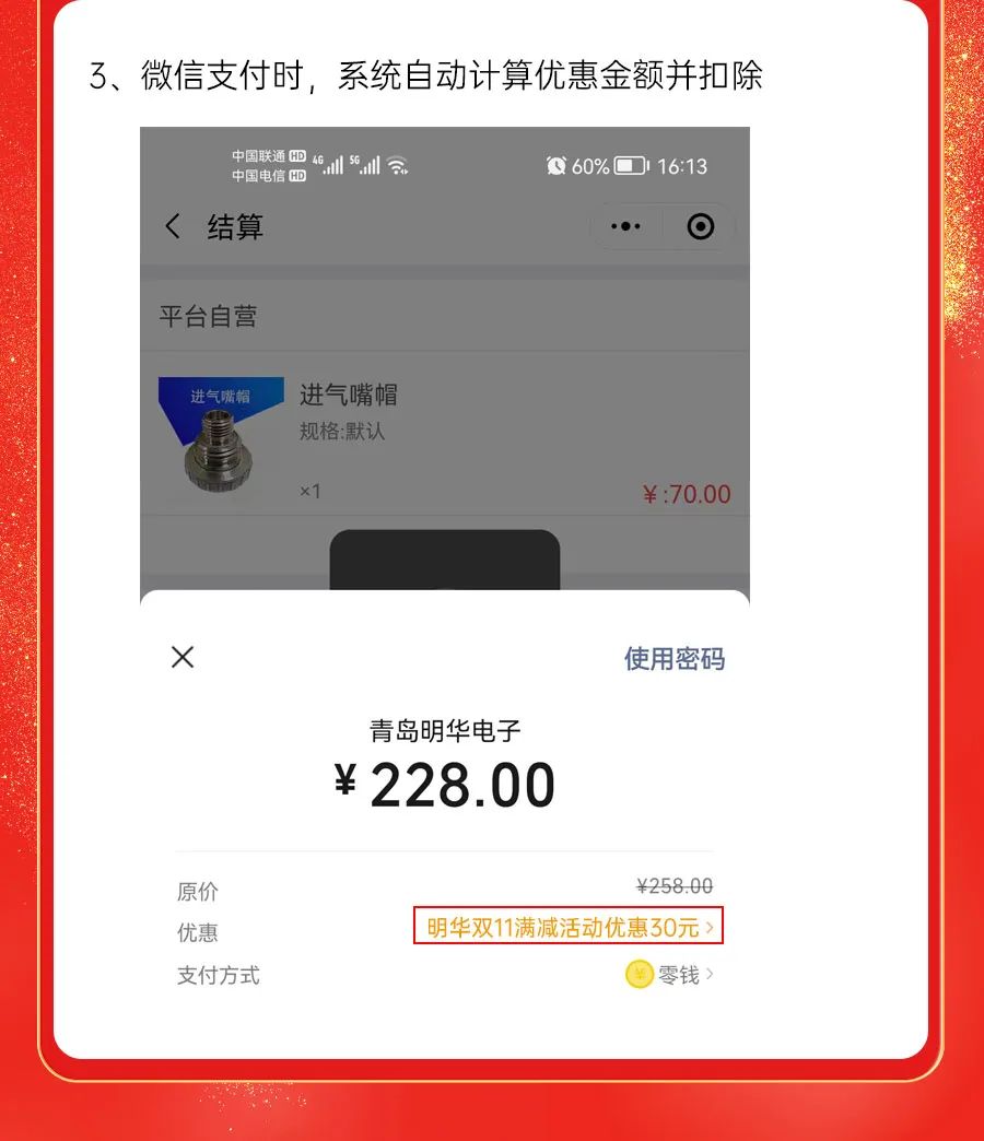 一年一度双11到来之际,为回馈新老用户的支持和厚爱,明华电子微信商城所有在售配件参加每满200-30优惠活动,不玩套路,一年*,真正让利用户。