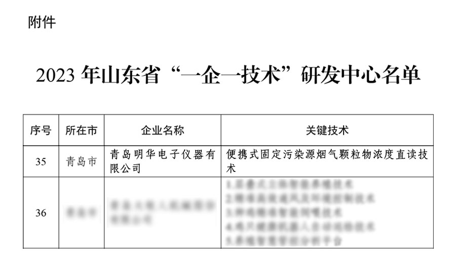 近日,山东省工业和信息化厅公布2023年山东省“一企一技术”研发中心名单,明华电子凭借“便携式固定污染源烟气颗粒物浓度直读技术”荣列榜单。