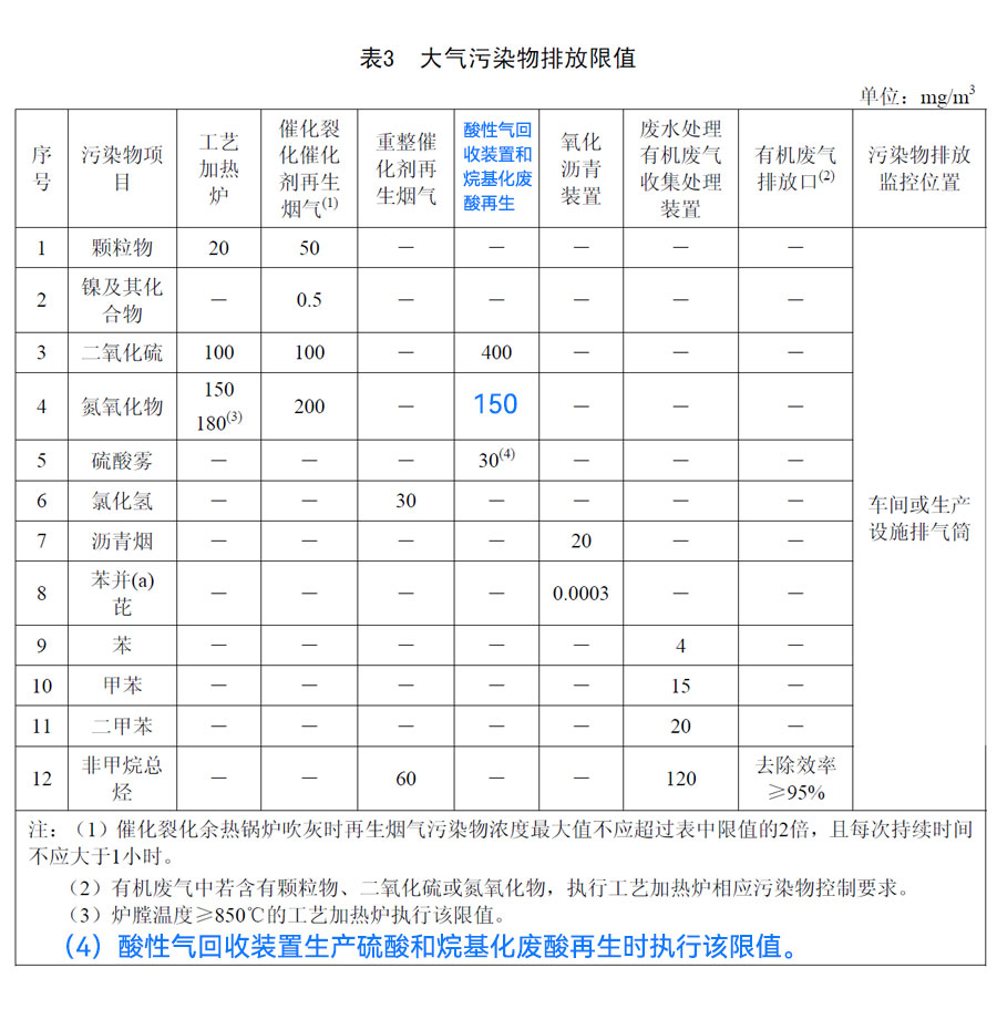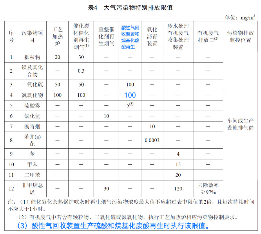 GB 31570-2015 增加“烷基化废酸再生”将“酸性气回收装置” 修改为“酸性气回收装置和烷基化废酸再生”,增加氮氧化物排放限值为150 mg/m3(表4为100 mg/m3)将脚注d(表4为脚注c)修改为“酸性气回收装置生产硫酸和烷基化废酸再生时执行该限值”。