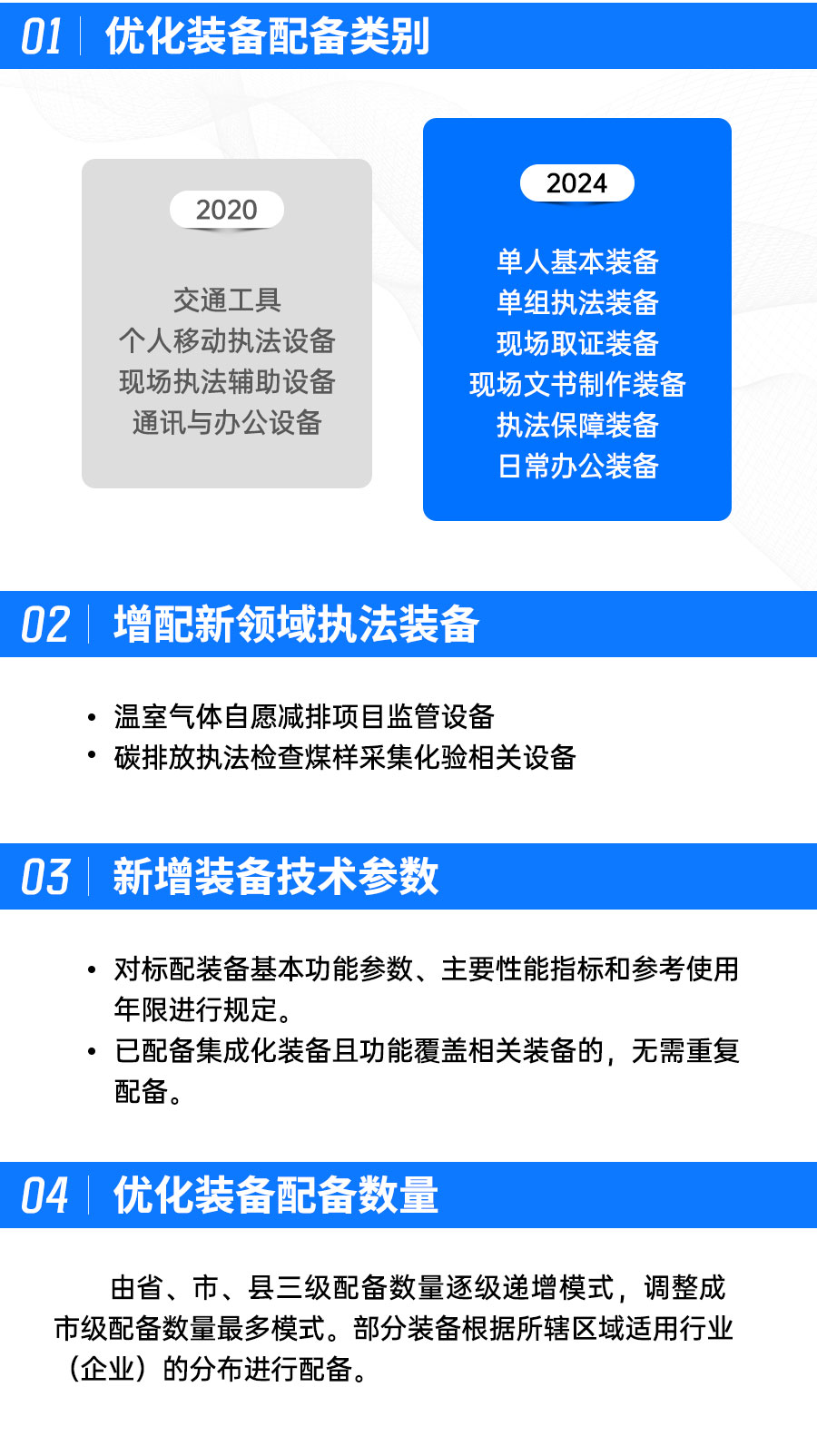 新标准与2020年发布的《指导标准》相比实用性更强,明确了装备的配备模式和管理要求、增加新领域执法装备、新增技术参数要求、调整了装备分类和配备数量。